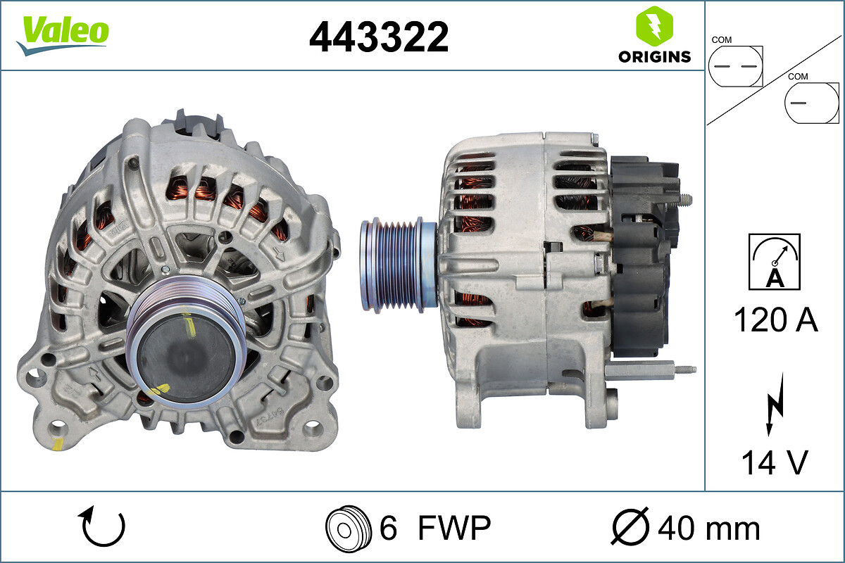 ограничение за производител: VALEOброй на ребрата: 6вид на закрепването: Закрепване в четири точкинапрежение: 14волтзаряден ток на генератор: 120Аклема: B+ / LIN VDAпосока на въртене: въртене по посока на часовниковата стрелкаремъчни шайби: с ремъчна шайбаремъчни шайби: с ремъчна шайба със свободен ходРемъчна шайба Ø: 54mmтегло: 6,62kg