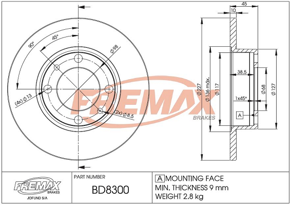 страна на монтаж: предна осброй на дупките за закрепване: 4вид на спирачния диск: плътенвисочина: 45mmвъншен диаметър: 227mmдебелина на спирачния диск: 10mmмин. дебелина: 9mmтегло: 2,8kgцентриращ диаметър: 68mm