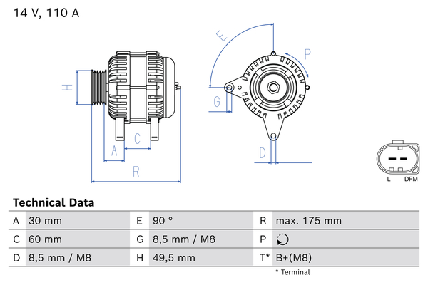 брой на каналите: 6напрежение: 12волтзаряден ток на генератор: 110Аклема: L-DFM(FR)клема: M8ремъчни шайби: с многоремъчна шайбаРемъчна шайба Ø: 49,0mm