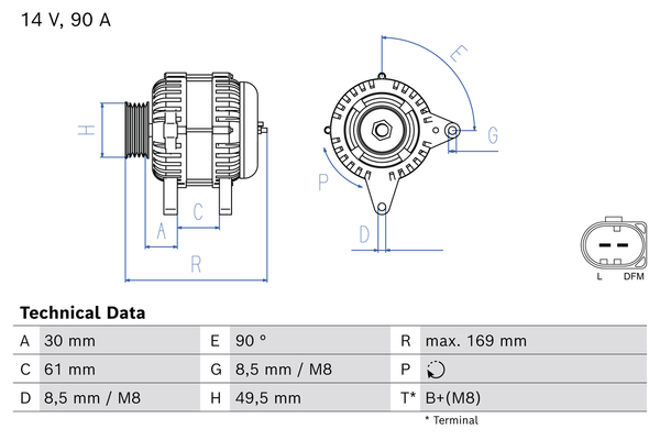 нова част: нова частограничение за производител: BOSCHброй на дупките за закрепване: 4брой на каналите: 6напрежение: 12волтзаряден ток на генератор: 90Акачество: +Lineклема: B+ (M8)Ремъчна шайба Ø: 50mm