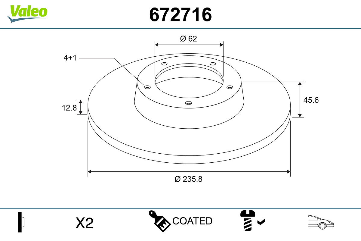 страна на монтаж: предна осброй на дупките: 4вид на спирачния диск: плътенвисочина: 46,3mmвъншен диаметър: 236mmдебелина на спирачния диск: 12,8mmмин. дебелина: 11,4mmповърхност: с покритиецентриращ диаметър: 62,1mm