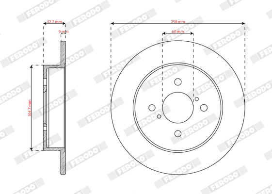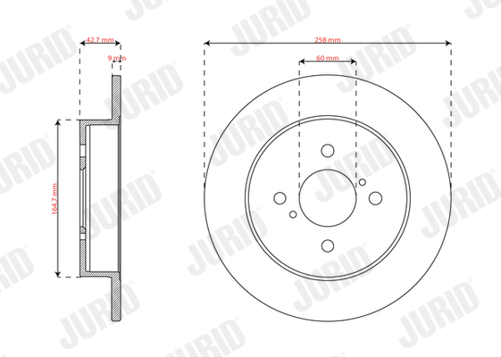 страна на монтаж: задна осброй на дупките: 4вид на спирачния диск: плътенвисочина: 42,60mmвъншен диаметър: 258mmдебелина на спирачния диск: 9mmмин. дебелина: 8mmповърхност: с покритиецентриращ диаметър: 60mm