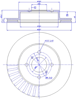 страна на монтаж: предна осджанта: 4-дупкивид на спирачния диск: вентилиранвисочина: 49,5mmвъншен диаметър: 257mmдебелина на спирачния диск: 17mmГлавина Ø: 163mmДиаметър на кръговата стъпка Ø: 100mmмин. дебелина: 15mmповърхност: с покритиетегло: 4,18kgцентриращ диаметър: 60mm