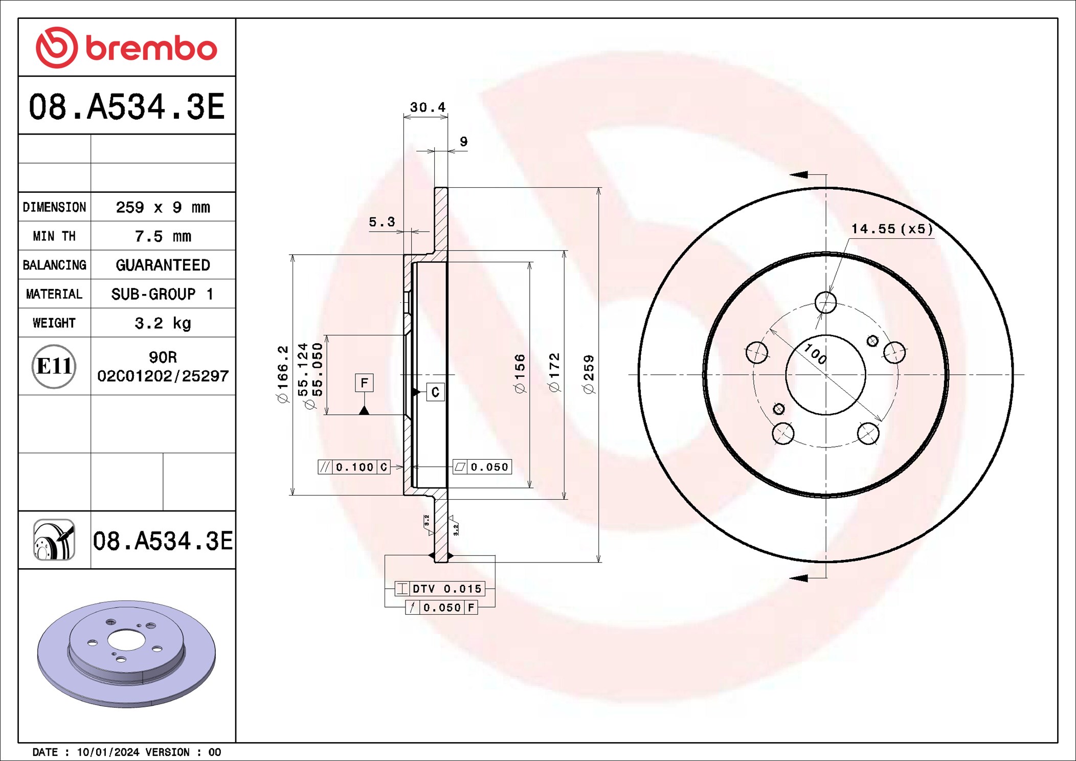 страна на монтаж: задна осброй на дупките: 5вид на спирачния диск: плътенвисочина: 30,2mmвъншен диаметър: 259,0mmвътрешен диаметър: 156,2mmдебелина на спирачния диск: 9,0mmОтвор Ø: 14,5mmДиаметър на кръговата стъпка Ø: 100,0mmмин. дебелина: 7,5mmповърхност: с покритиецентриращ диаметър: 55,0mm