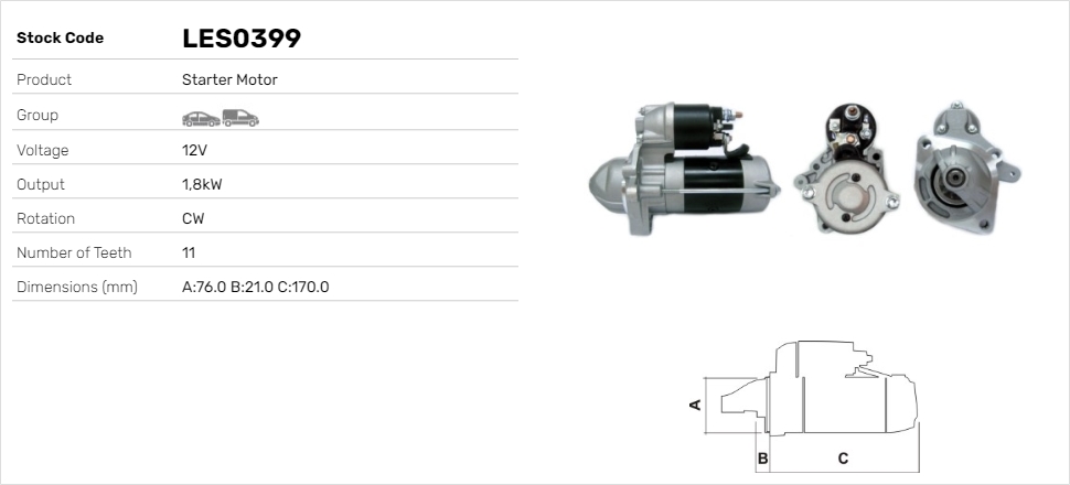 TECDOC-номер на двигател: 28374брой на зъбите: 11напрежение: 12волтстартова мощност: 1,8киловатпосока на въртене: въртене по посока на часовниковата стрелка