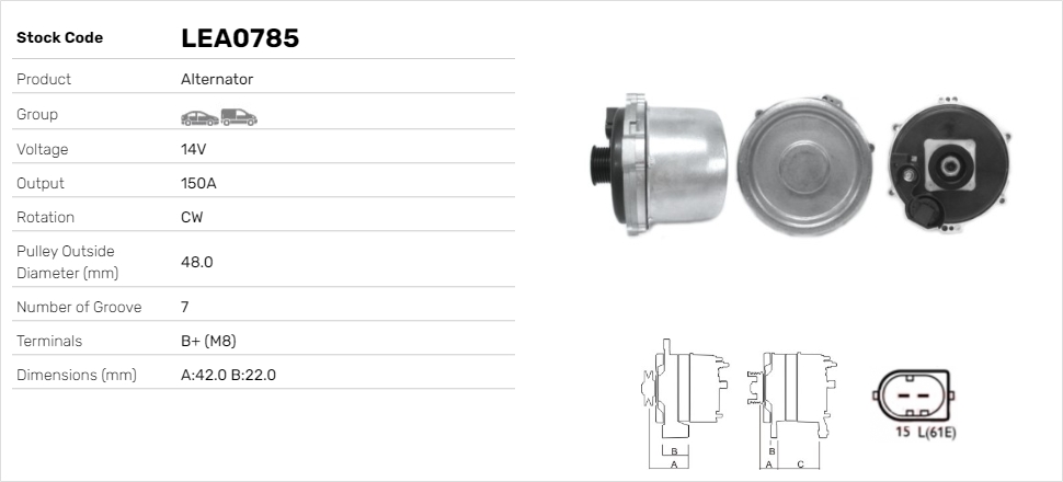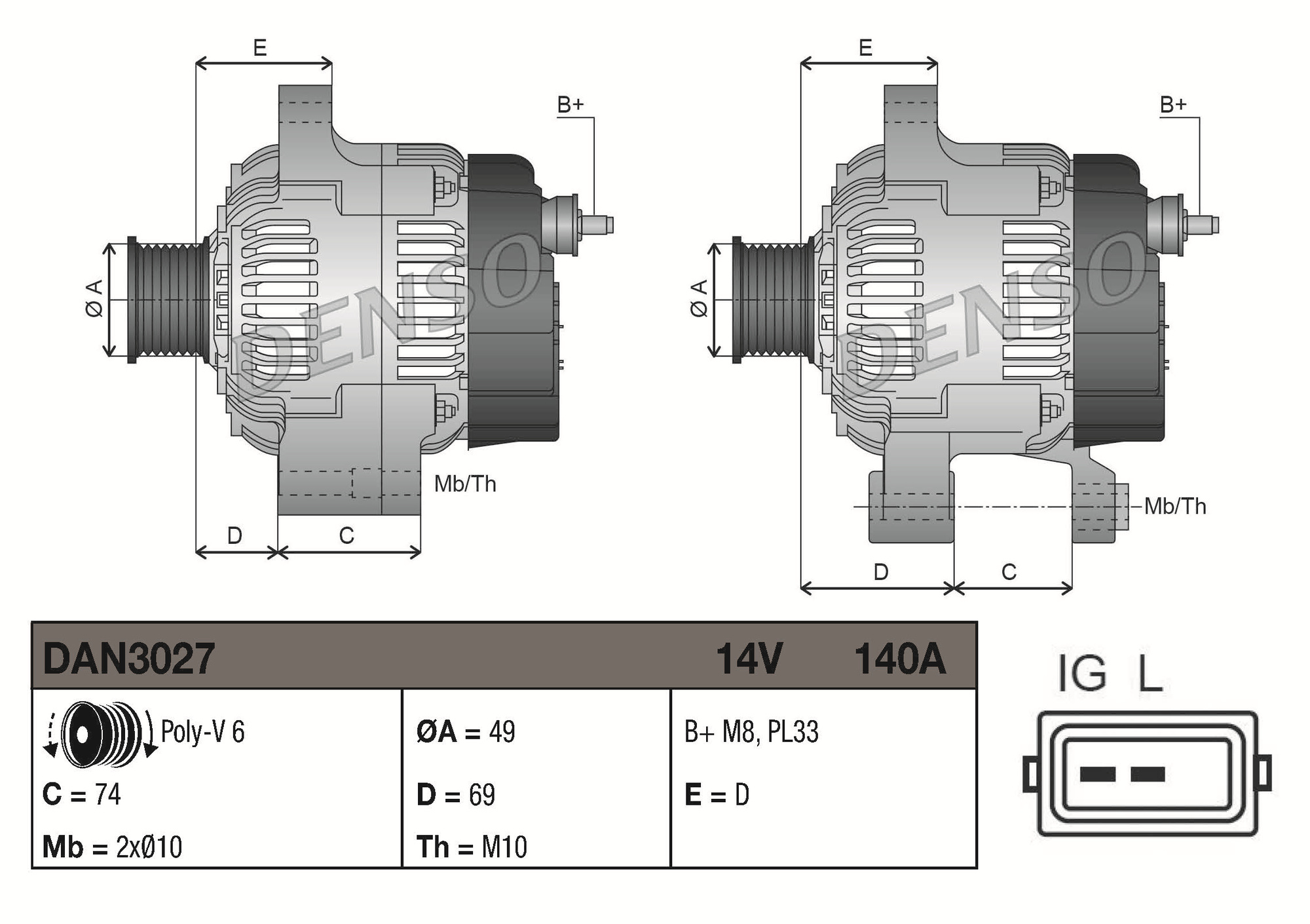 ID-изпълнение на щекера: CPA0235брой на ребрата: 6гаранция: 2 години гаранциянапрежение: 12волтзаряден ток на генератор: 140Аконтакт/клема: без връзка за оборотомерремъчни шайби: с шайба за пистов ремъкРемъчна шайба Ø: 51mm