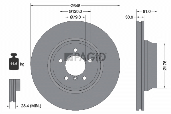 страна на монтаж: предна осджанта: 5-дупкивид на спирачния диск: вентилиранвисочина: 81,5mmвъншен диаметър: 348mmдебелина на спирачния диск: 30mmГлавина Ø: 176mmДиаметър на кръговата стъпка Ø: 120mmмин. дебелина: 28,4mmповърхност: с покритиетегло: 11,36kgцентриращ диаметър: 79mm