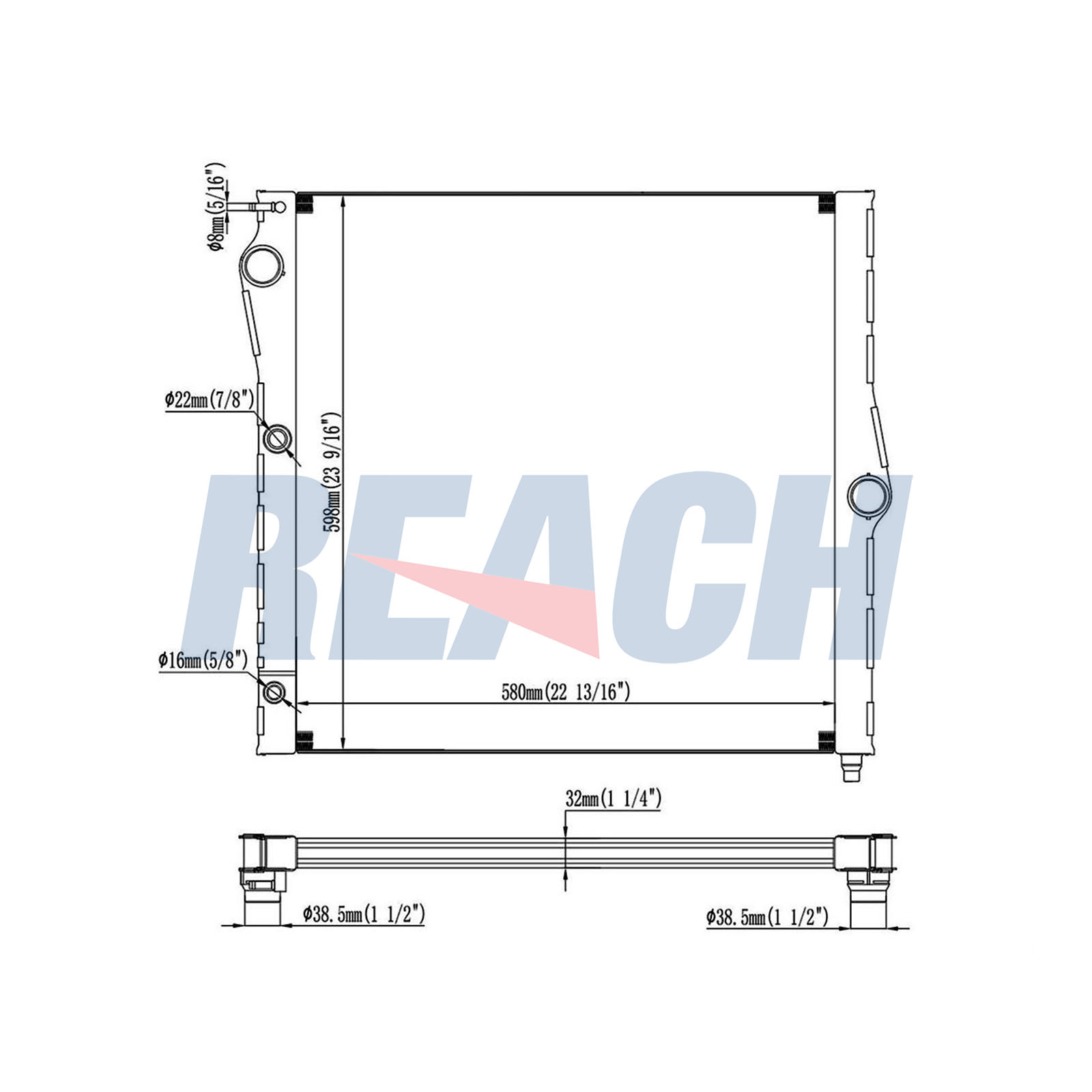 дълбочина на мрежа: 32mmдължина на мрежа: 585mmизпълнение на охладител: запоени охлацдащи ламелиматериал на ламелите на радиатора: алуминийматериал на резервоар (охладител): пластмасаширина на мрежа: 600mm
