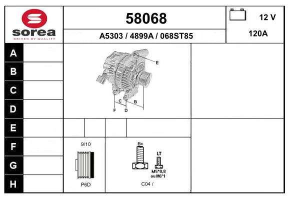 брой на дупките за закрепване: 3брой на каналите: 6напрежение: 12волтзаряден ток на генератор: 120Аремъчни шайби: с ремъчна шайба със свободен ходРемъчна шайба Ø: 54mm