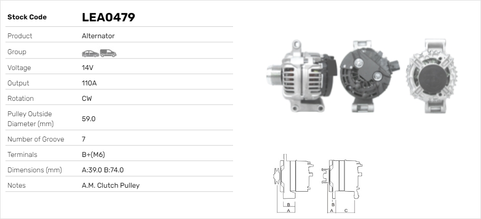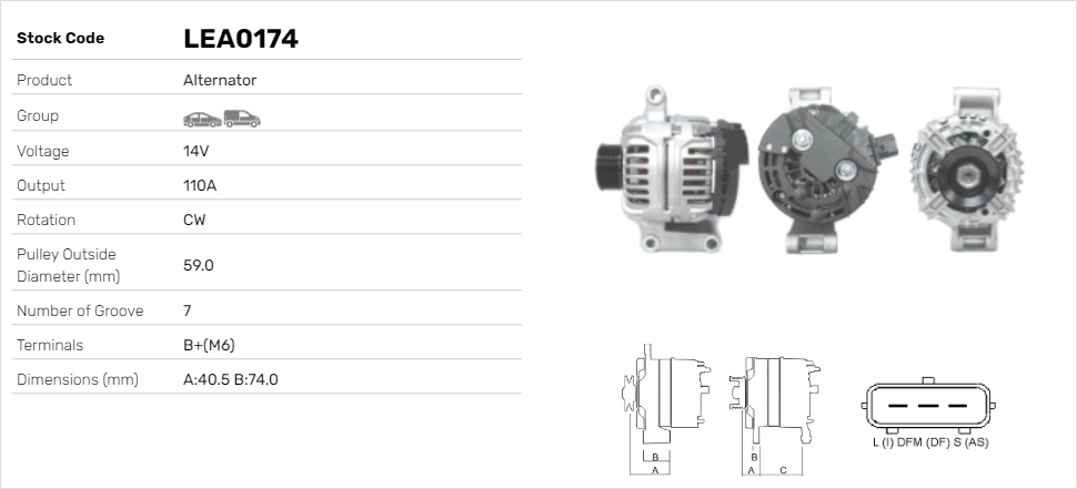 ID-изпълнение на щекера: L,DFM,S,B+брой на дупките за закрепване: 3брой на ребрата: 7напрежение: 12волтзаряден ток на генератор: 110Аремъчни шайби: с ремъчна шайба със свободен ходРемъчна шайба Ø: 59mmформа на корпуса на щекера: Правоъгълен