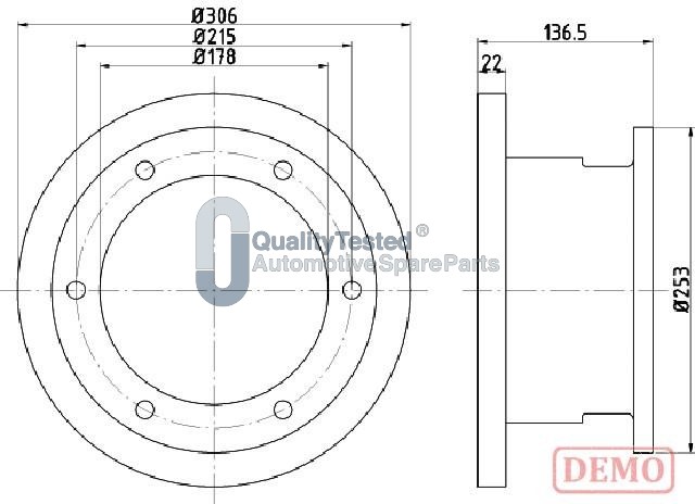 страна на монтаж: задна осджанта: 6-дупкивид на спирачния диск: плътенвисочина: 136,5mmвъншен диаметър: 306mmдебелина на спирачния диск: 22mmГлавина Ø: 253mmДиаметър на кръговата стъпка Ø: 215mmмин. дебелина: 19mmтегло: 14,14kgцентриращ диаметър: 190mm