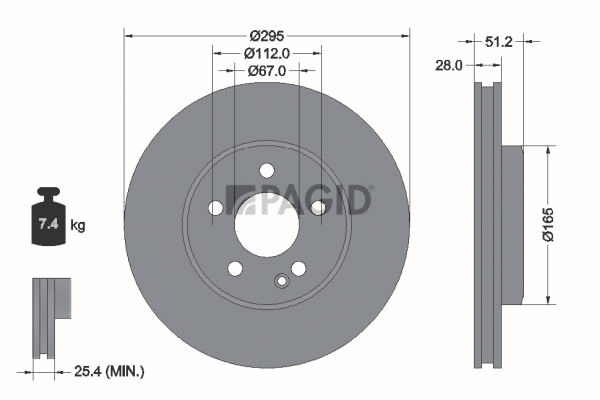 обурудване на автомобила: за автомобили без спортен пакетстрана на монтаж: предна осджанта: 5-дупкивид на спирачния диск: вентилиранвисочина: 51,1mmвъншен диаметър: 295mmдебелина на спирачния диск: 28mmГлавина Ø: 164mmДиаметър на кръговата стъпка Ø: 112mmмин. дебелина: 25,4mmповърхност: с покритиетегло: 7,4kgцентриращ диаметър: 67mm