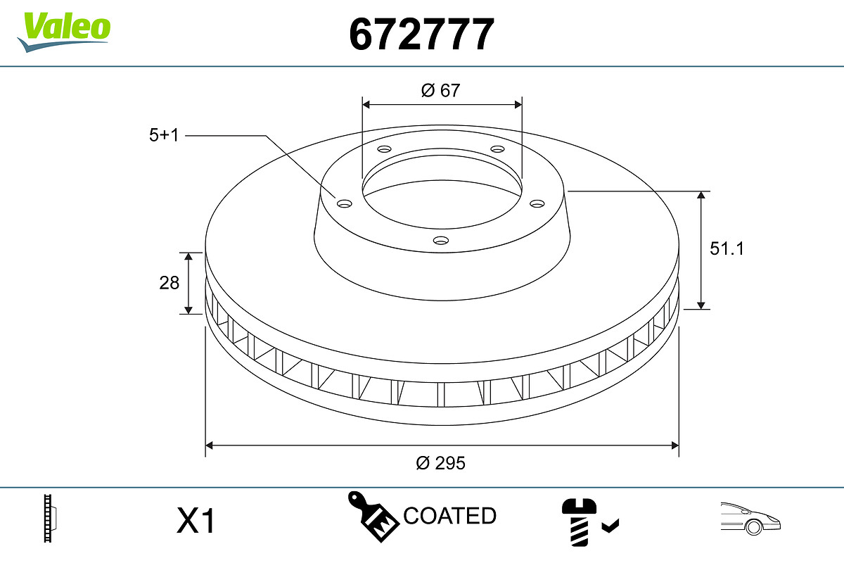 обурудване на автомобила: за автомобили със спортен пакетджанта: 5-дупкивид на спирачния диск: вентилиранвисочина: 51,1mmвъншен диаметър: 295mmдебелина на спирачния диск: 28mmмин. дебелина: 26mmстрана на монтаж: предна остегло: 8,34kgцентриращ диаметър: 67mm