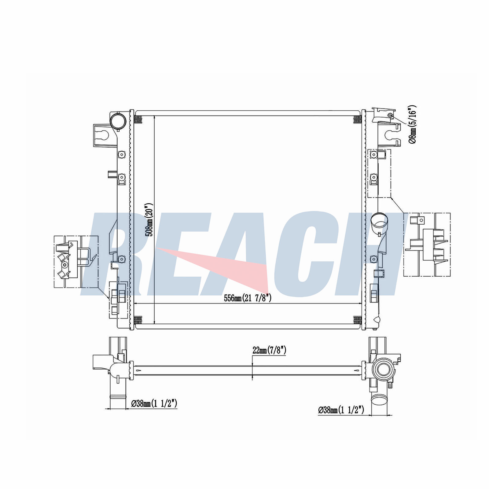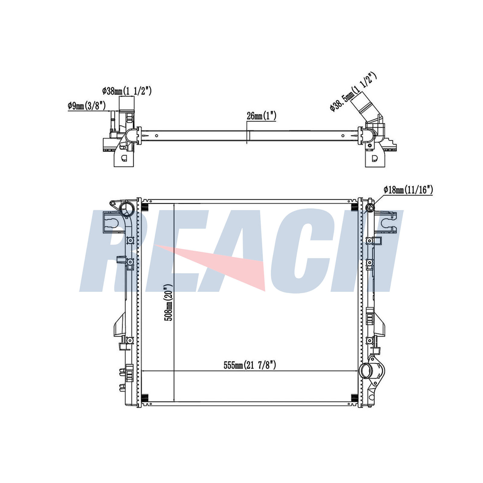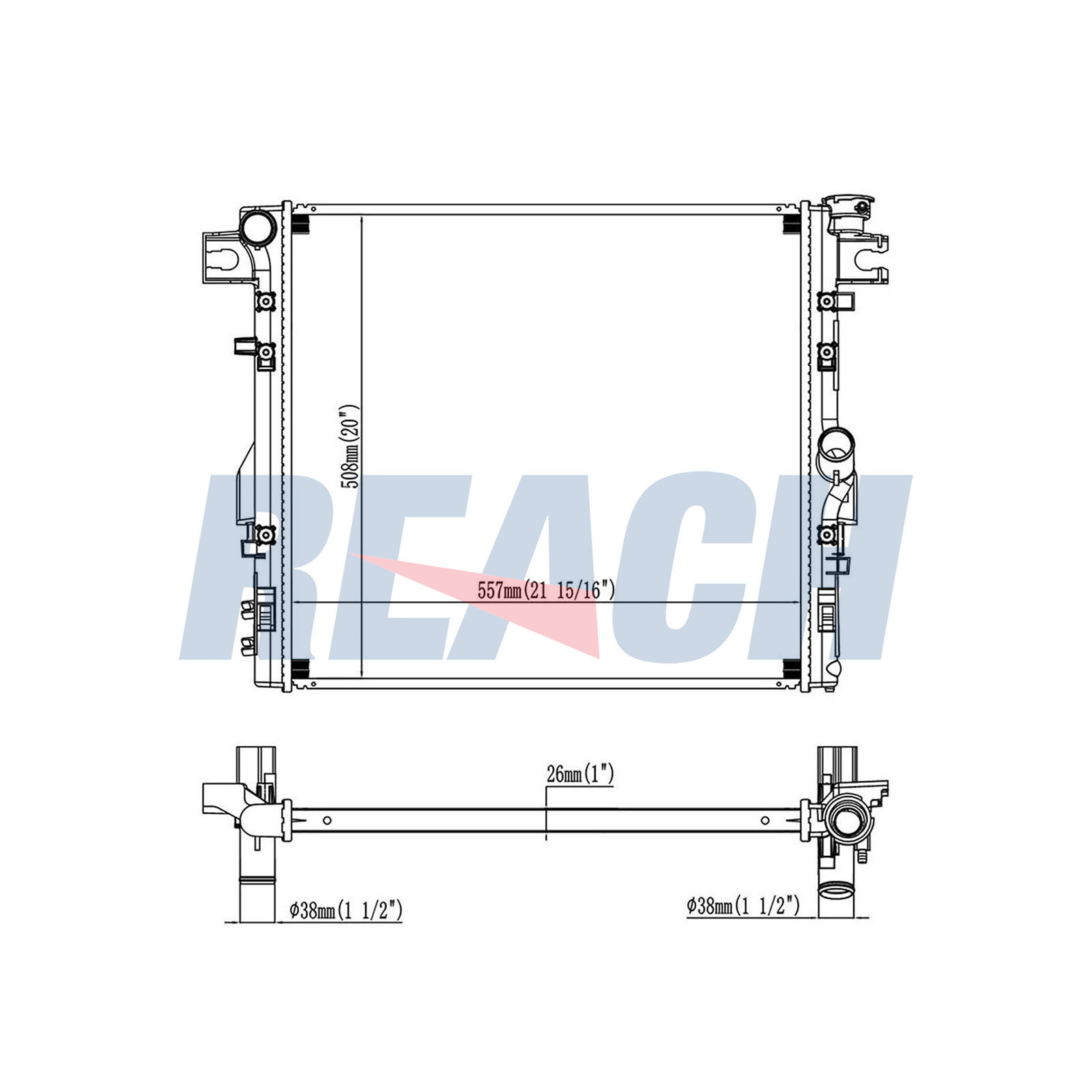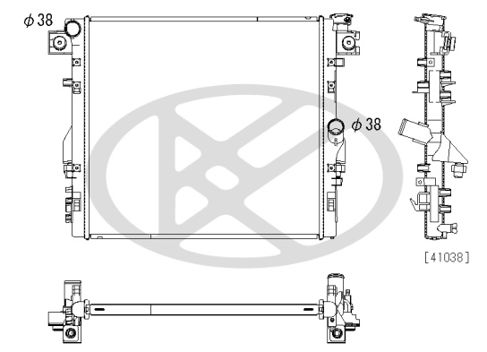 Входящ отвор Ø: 38mmдоп. артикул/доп. инфо. 2: без разширителен съддълбочина на мрежа: 26mmдължина на мрежа: 558mmизпълнение на охладител: запоени охлацдащи ламелиИзходящ отвор Ø: 38mmматериал на ламелите на радиатора: алуминийматериал на резервоар (охладител): пластмасаширина на мрежа: 511mm
